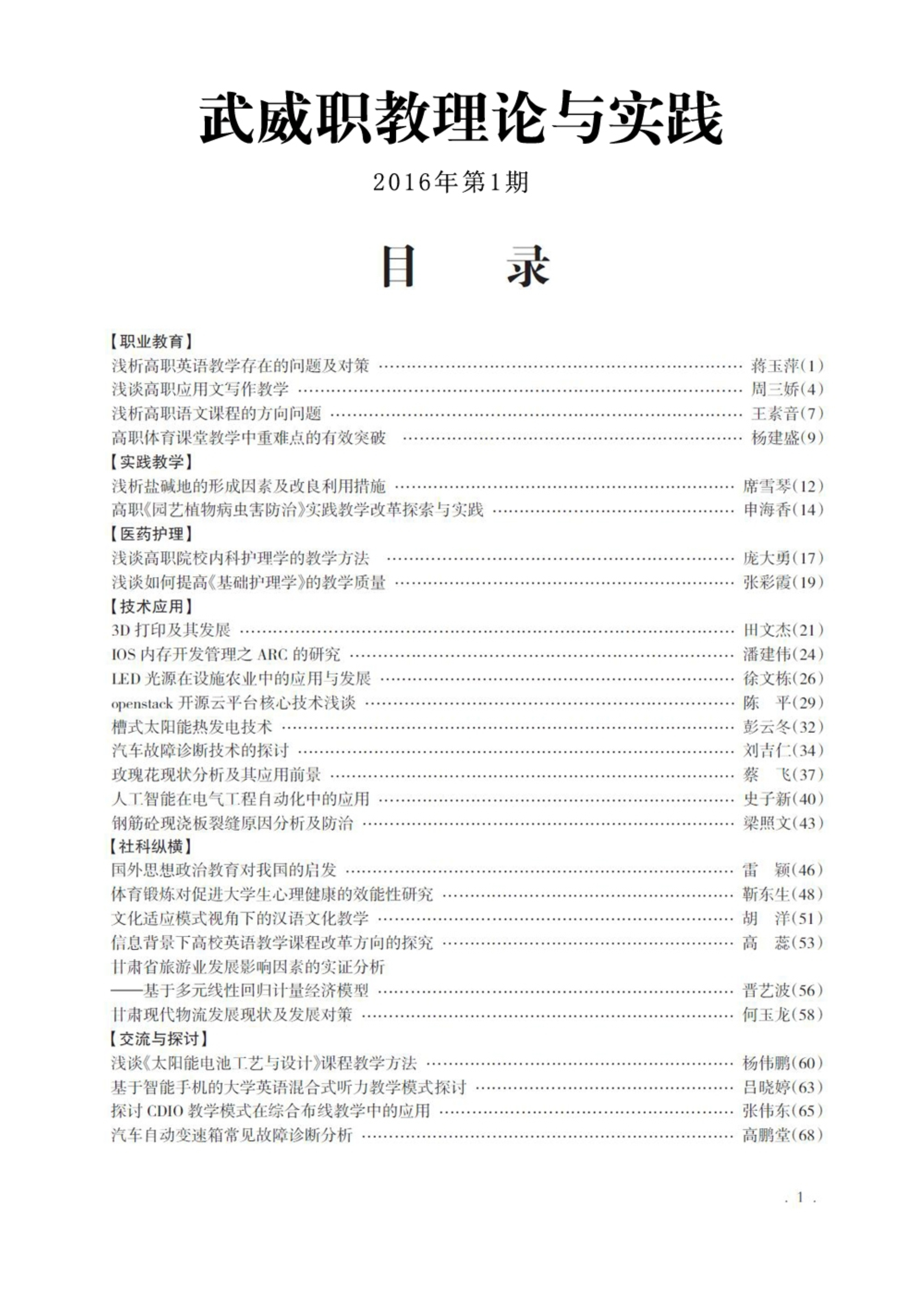 2016年第1期《武威职教理论与实践》