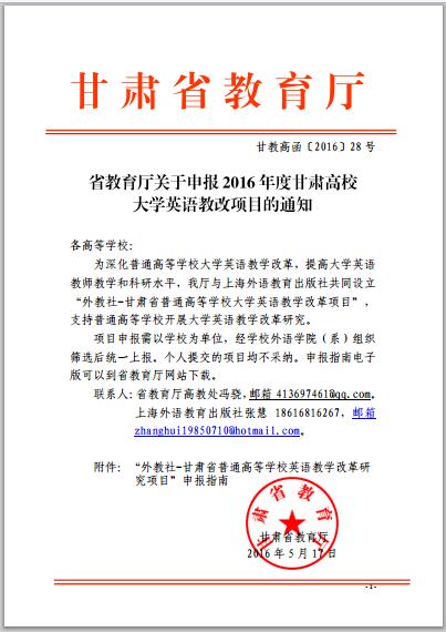 省教育厅关于申报2016年度甘肃高校大学英语教改项目的通知