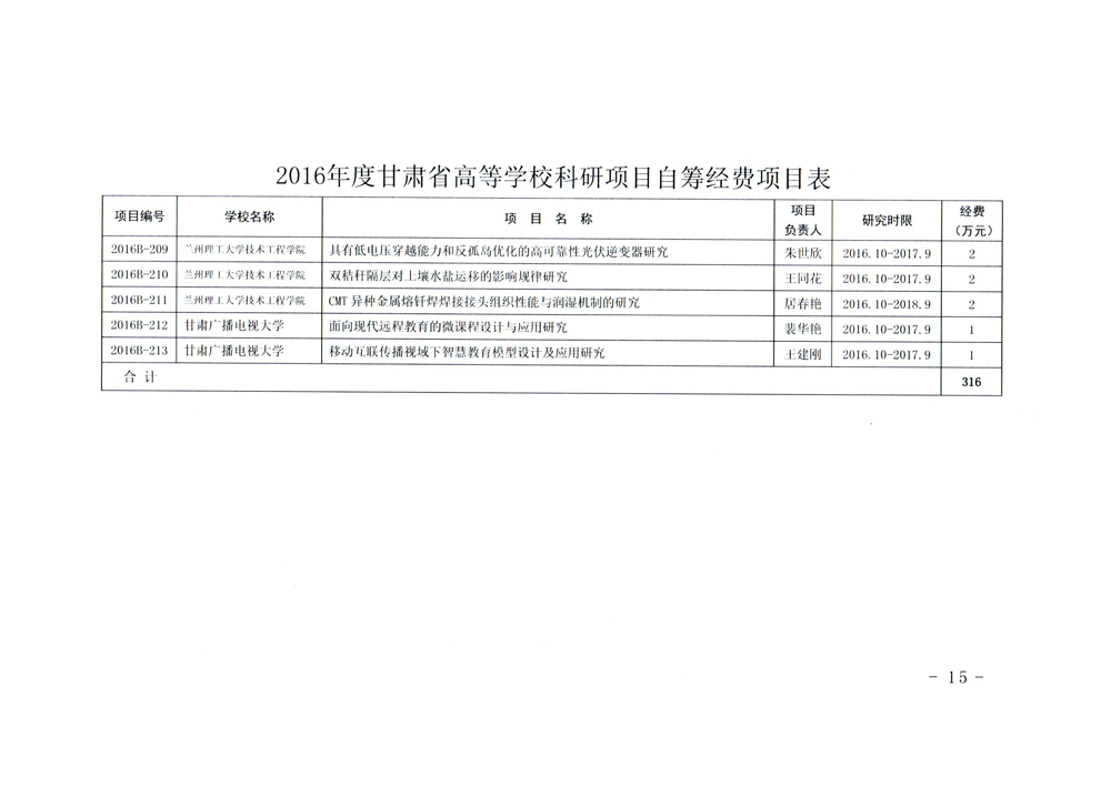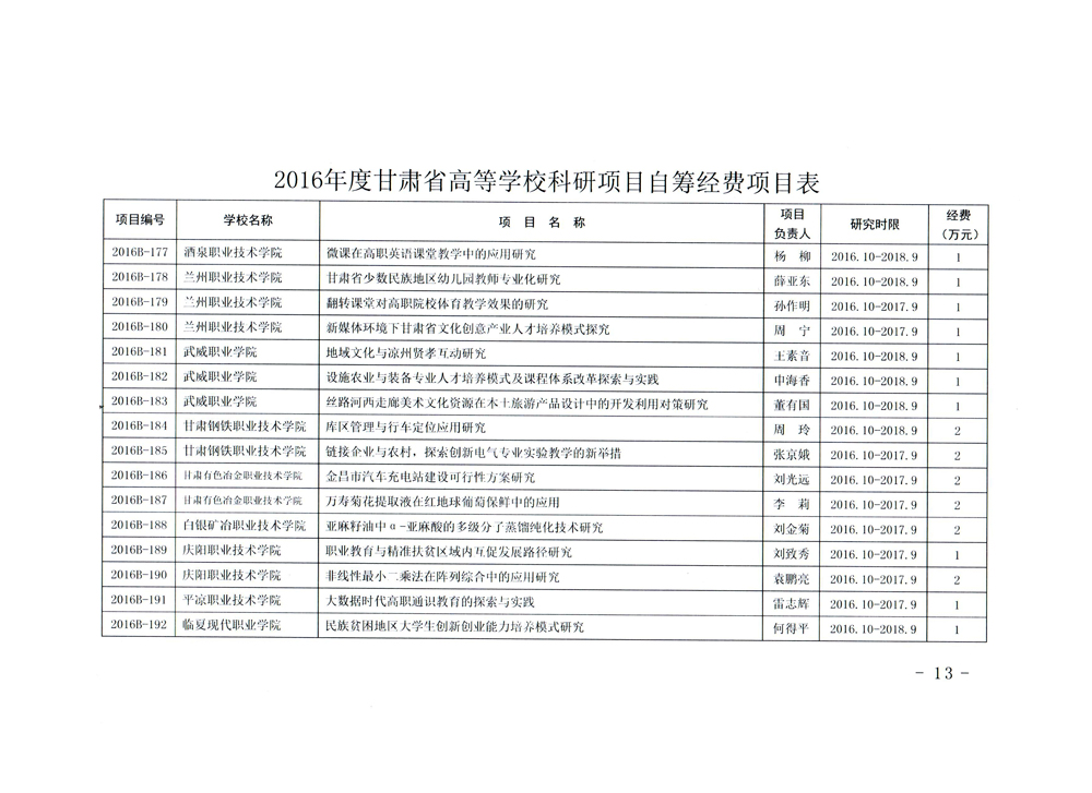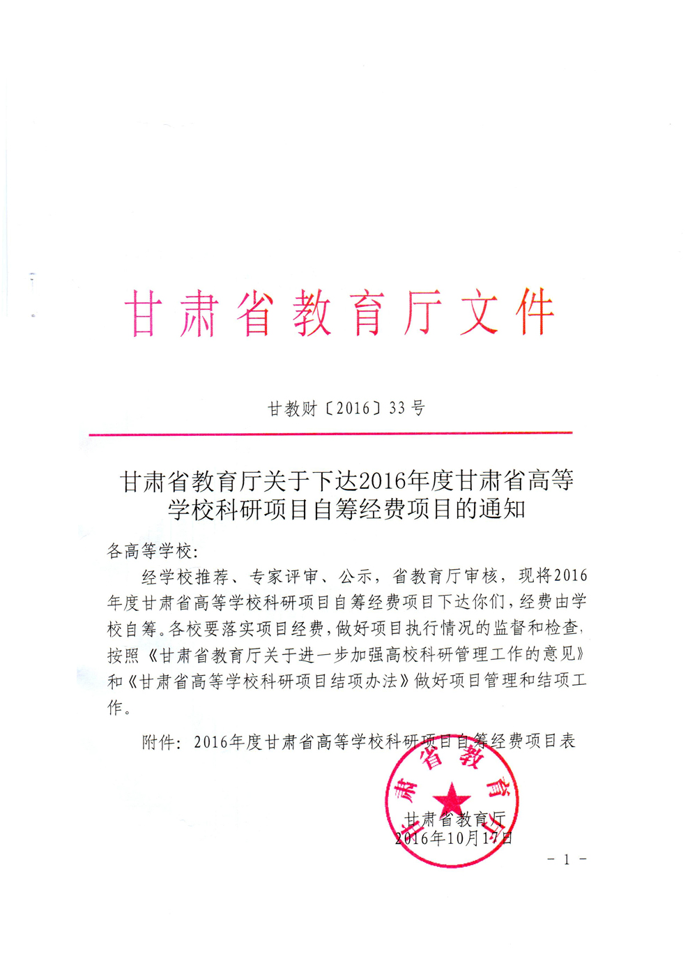 甘肃省教育厅关于下达2016年度甘肃省高等学校科研项目自筹经费项目的通知