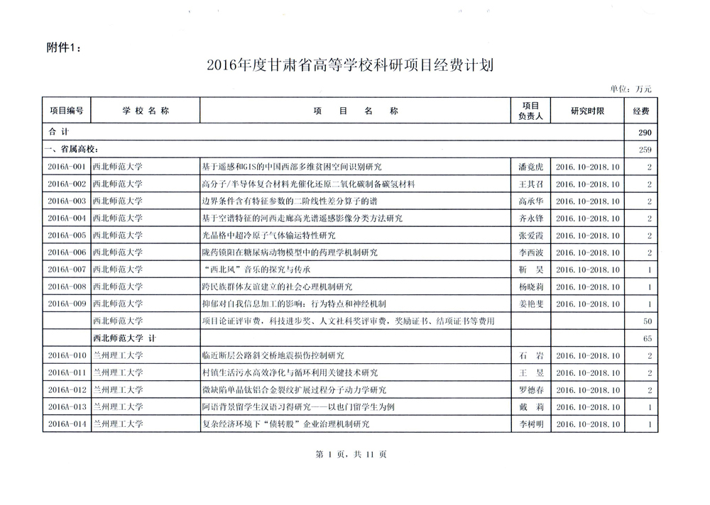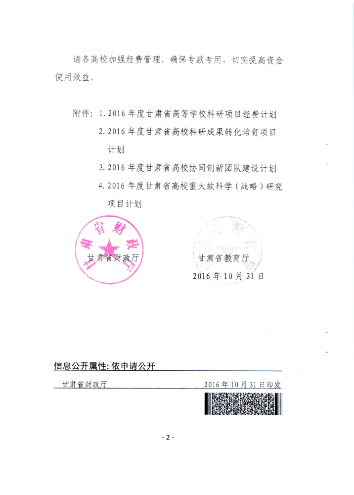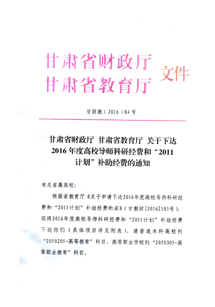 甘肃省教育厅关于下达2016年度甘肃省高等学校科研项目自筹经费项目的通知