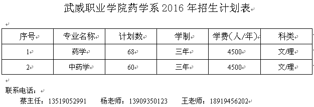 武威职业学院药学系2016年招生计划