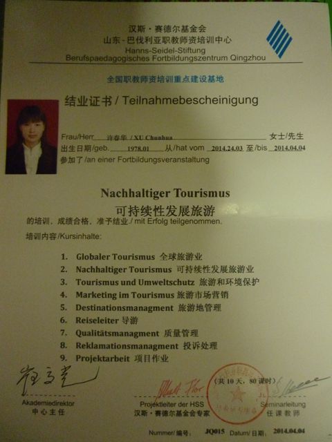 2014年3月24日至4月4日,我院旅游管理专业骨干教师马静、许春华参加了德国汉斯·赛德尔基金会(Hanns Seidel Stiftung)在酒泉职业技术学院举办的“可持续性发展旅游”师资培训班。