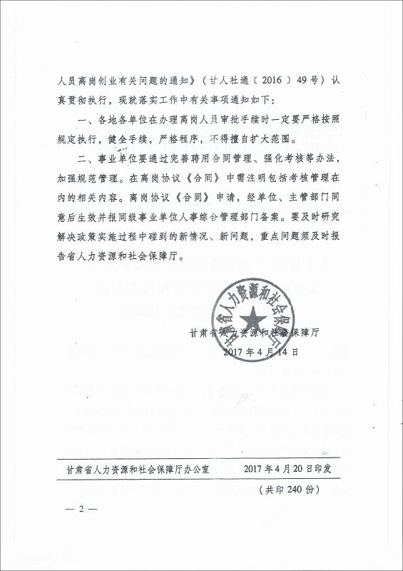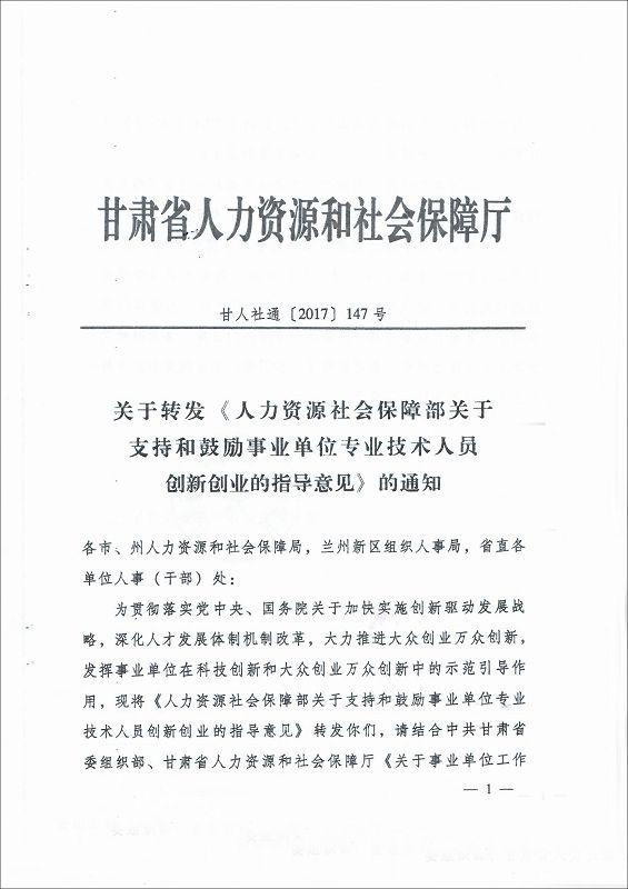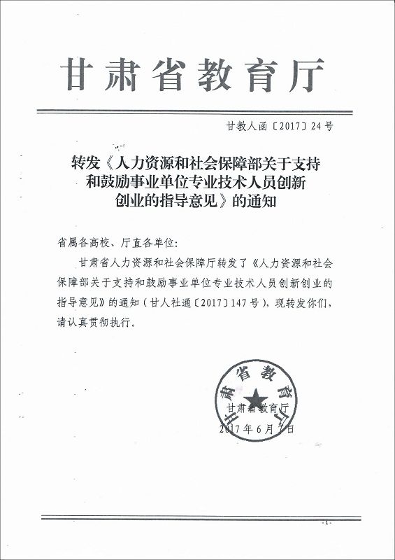 甘肃省教育厅转发《人力资源和社会保障部关于支持和鼓励事业单位专业技术人员创新创业的指导意见》的通知