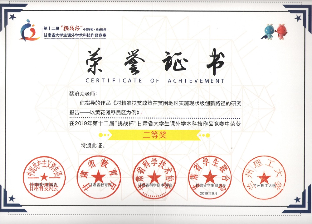 第十二届“挑战杯”甘肃省大学生课外学术科学作品《对精准扶贫政策在贫困地区实施现状级创新路径的研究报告-以黄花滩移民为例》