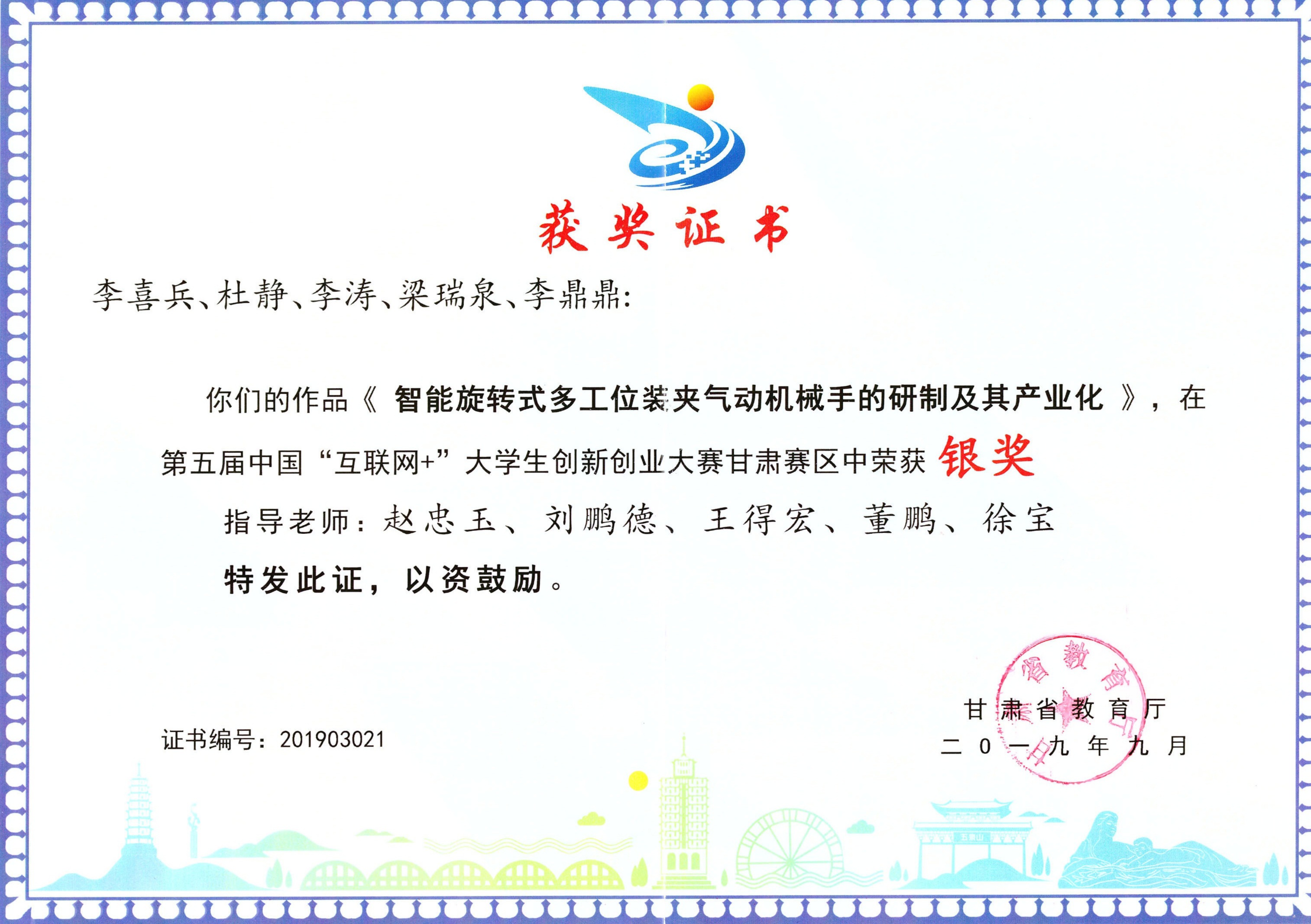 .第五届中国“互联网+”大学生创新创业大赛甘肃赛区《智能旋转式多工位装夹气动机械手的研制及其产业化》