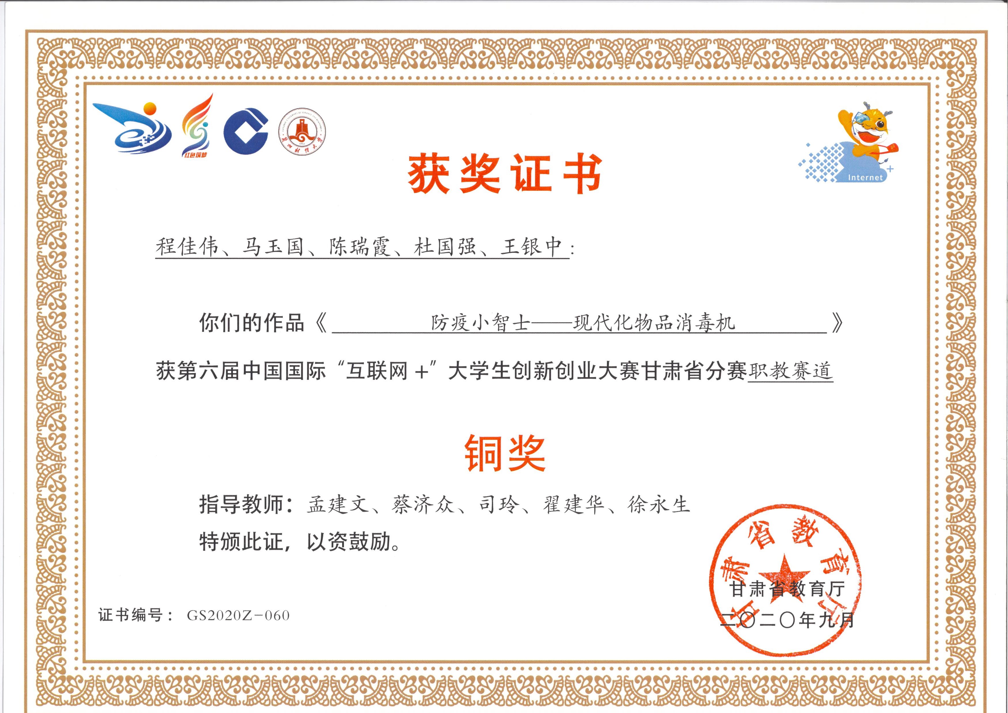 第六届中国国际“互联网+”大学生创新创业大赛甘肃省分赛职教赛道《防疫小智士—现代化物品消毒机》