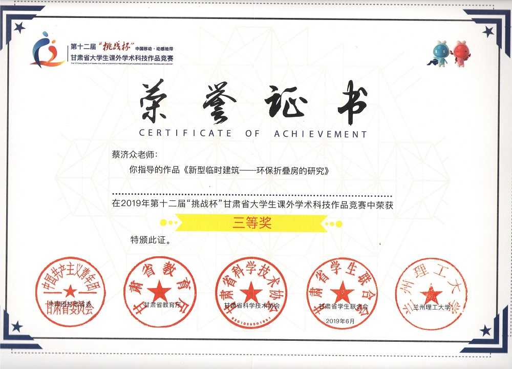 第十二届“挑战杯”甘肃省大学生课外学术科学作品《新型临时建筑—环保折叠房的研究》