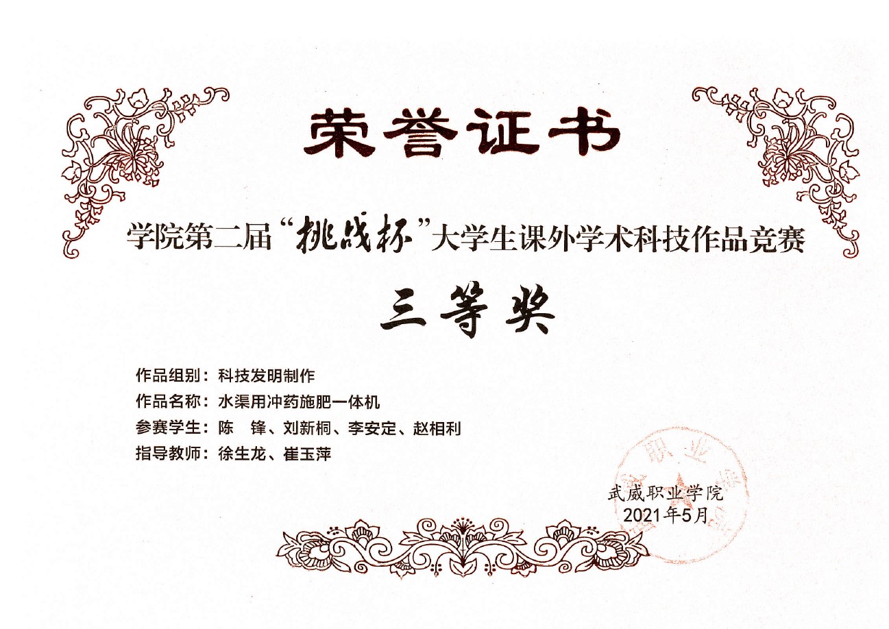 武威职业学院第二届“挑战杯”大学生课外学术科技作品《水渠用冲药施肥一体机》