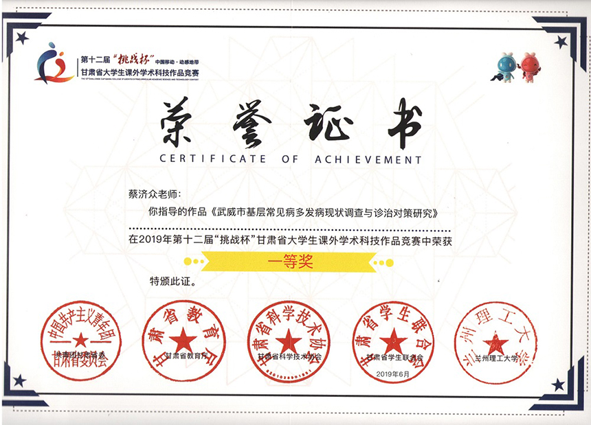 第十二届“挑战杯”甘肃省大学生课外学术科学作品《武威市基层常见病多发病现状调查与诊治对策研究》