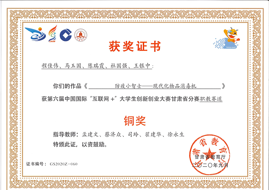 第六届中国国际“互联网+”大学生创新创业大赛甘肃省分赛职教赛道《防疫小智士—现代化物品消毒机》”
