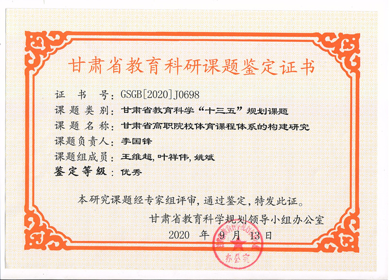 6.2020年项目组成员李国锋完成甘肃省教育科学“十三五”规划课题《甘肃省高职院校体育课程体系的构建研究》已结项获优秀奖 【鉴定证书】