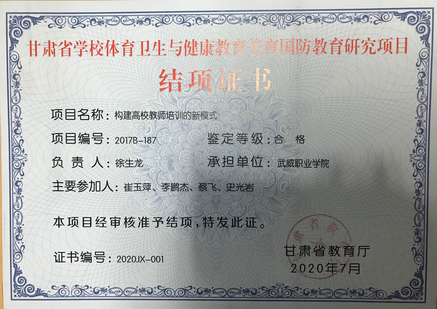 9.2020年项目组成员徐生龙主持完成甘肃省学校体育卫生与健康教育美育国防教育研究项目《构建高校教师培训的新模式》 结项 【结项证书】