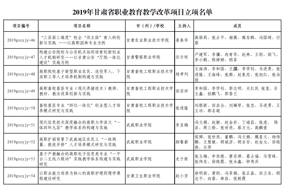 11.2019年项目组成员董鹏参加职业教育改革研究项目《高职扩招背景下武威地区农民工“一体两翼,德技并修”人才培养模式研究与实践》结项【立项通知】 【立项名单】