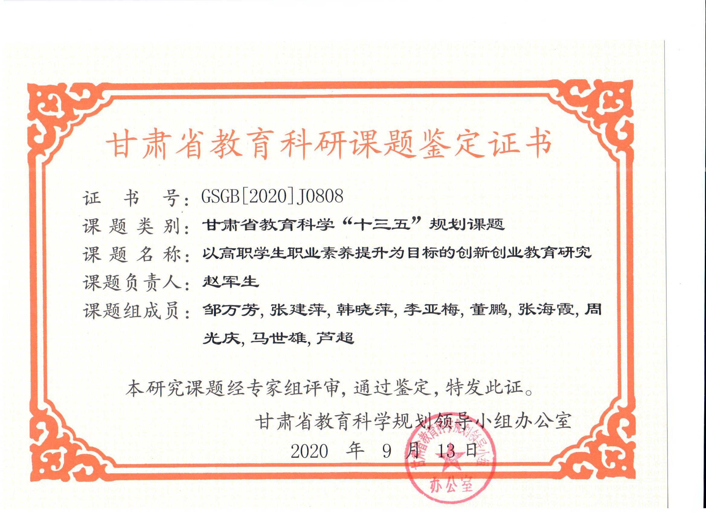 13.2020年项目组成员董鹏完成甘肃省教育科学“十三五”规划课题《以高职学生职业素养提升为目标的创新创业教育研究》 结项 【鉴定证书】