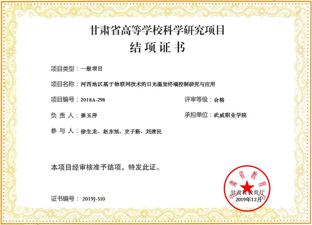 19.2019年项目组成员崔玉萍主持完成甘肃省高等学校科学研究项目《河西地区基于物联网技术的日光温室终端控制研究与应用》 结项 【结项证书】