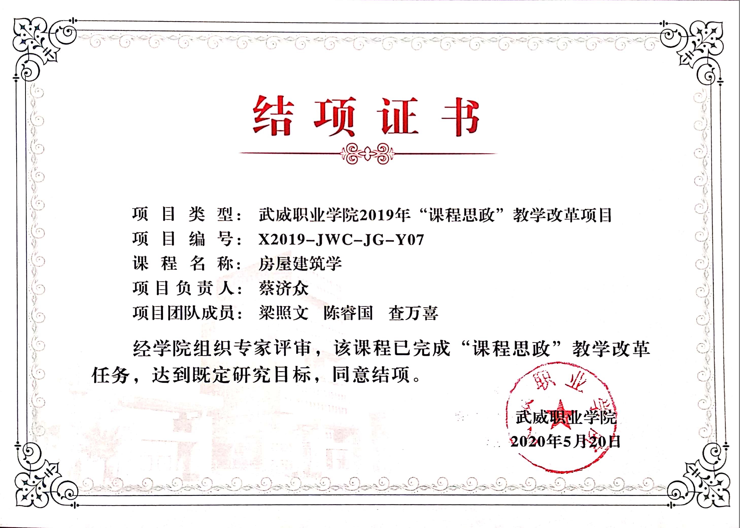 26.2020年项目组成员蔡济众、陈睿国主持完成《房屋建筑学》课程思政改革 结项 【结项证书】
